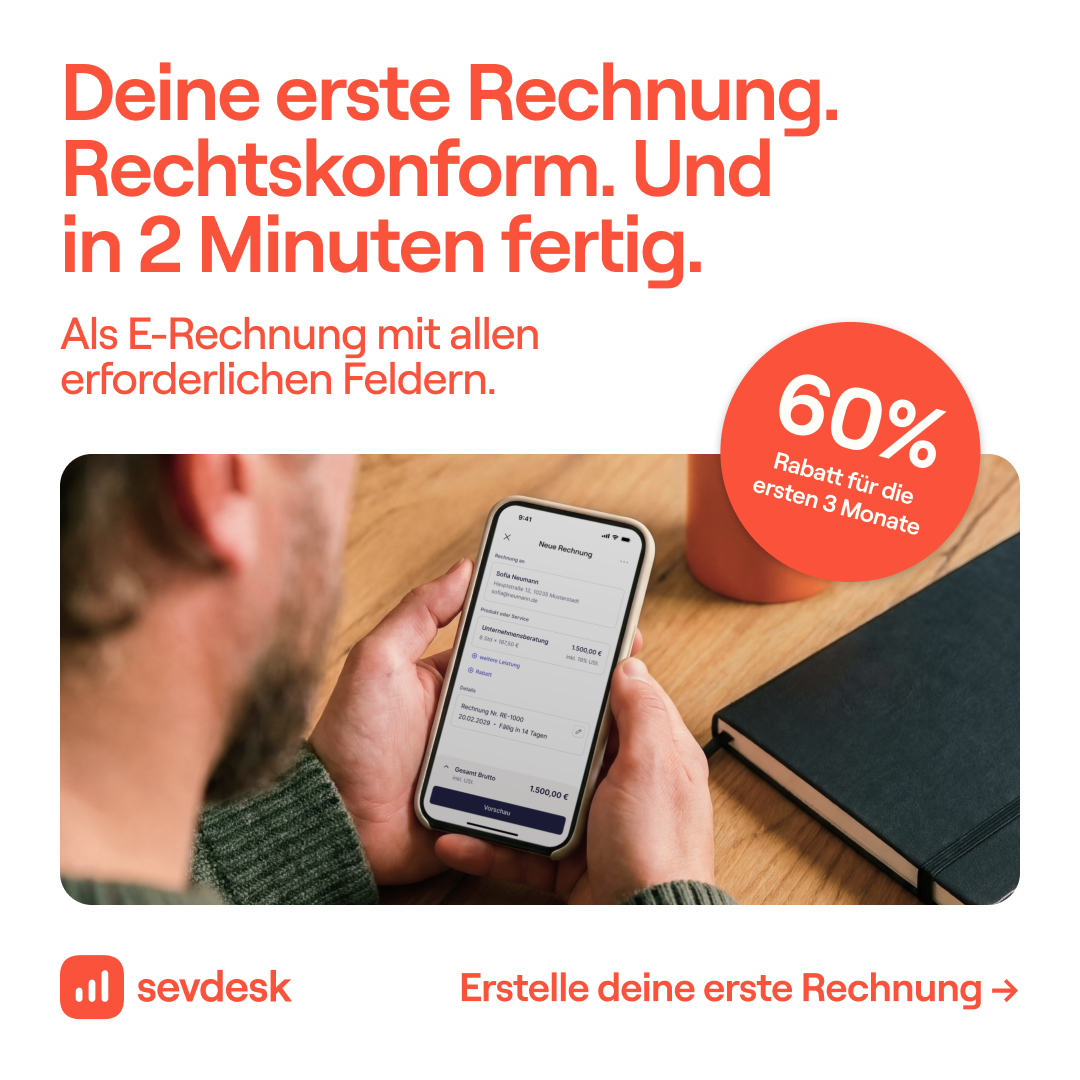 Trotzdem lohnt es sich, das Thema E-Rechnung im Blick zu behalten. Denn elektronische Rechnungsformate gewinnen weiter an Bedeutung. Und das nicht nur durch die schrittweise Einführung im B2B-Bereich, sondern auch durch europäische Digitalisierungspläne für die kommenden Jahre. Wenn du heute schon digital arbeitest, bist du für neue Anforderungen gut vorbereitet und kannst Rechnungen flexibel in dem Format erstellen, das zu deinem Geschäftsalltag passt. Mit einer Lösung wie sevdesk gelingt dir das außerdem ohne zusätzlichen Aufwand – vom Rechnungsschreiben bis zum Empfang von E-Rechnungen.